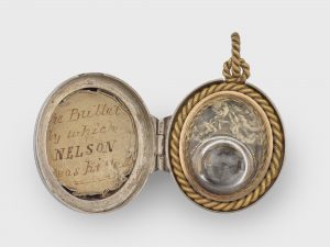 One of the joys of history is that most things entwine with each other, although that’s sort of literally the case here. The bullet which killed Nelson, along with bits of his coat that got caught up with it, are exhibited at the Queen’s Guard Chamber at Windsor Castle. It was taken from Nelson’s body by William Beatty, the doctor of HMS Victory, who decided that he quite fancied having a souvenir of the whole incident. He wore this locket for the rest of his life, but when he died his family donated it (probably with some relief) to Queen Victoria.