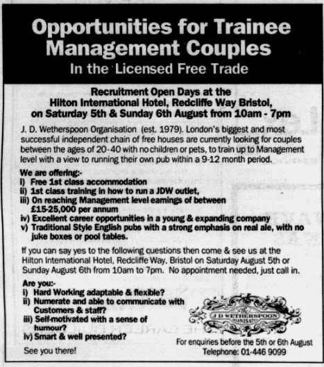 A JD Wetherspoon employment advert from the 1980s, back when employers could be a little more restrictive with who they wanted.