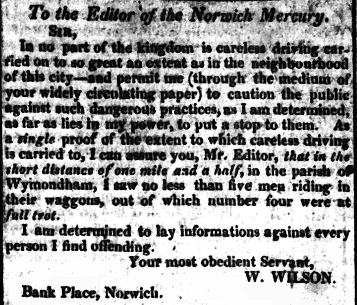In no part of the kingdom is careless driving carried on to so great an extent as in the neighbourhood of this city—and permit me (through the medium of your widely circulating paper) to caution the public against such dangerous practices, as I am determined, as far as lies in my power, to put a stop to them. As a single proof of the extent to which careless driving is carried to, I can assure you, Mr. Editor, that in the short distance of one mile and a half, in the parish of Wymondham, I saw no less than five men riding in their waggons, out of which number four were at full trot. I am determined to lay informations against every person I find offending.