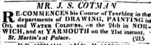 200 years ago this week in the Norwich Mercury is this advert placed by John Sell Cotman. This wasn’t a new thing for him, he had been doing it for many years and so it must have been successful in getting work in.