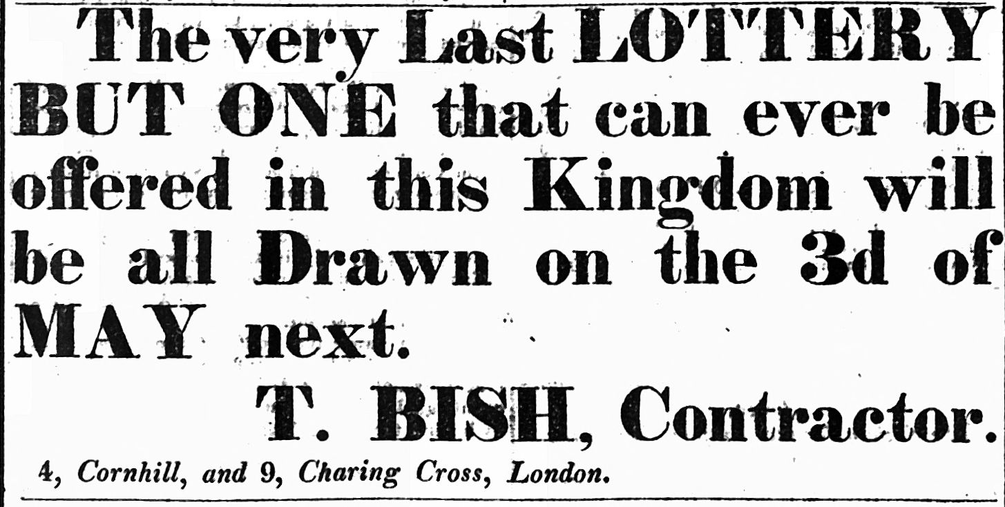 Bish was the most prominent lottery contractor of his day and he turned the sale of state lottery tickets into a massive marketing spectacle. Operating out of offices at 4 Cornhill and 9 Charing Cross in London he managed to get his whole lottery system sanctioned by the state. He put bold ads in newspapers, such as the Norwich Mercury, he created eye-catching handbills and used humour in his adverts. He was ahead of his time.