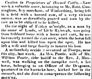 “Caution to Proprietors of Horned Cattle. – Last week a valuable mare, belonging to Mr. Robt. Cunningham, hay merchant, of Winfarthing, being left in a field with a horned cow, of a very vicious nature, was so dreadfully gored and torn by the cow as to be obliged to be killed.