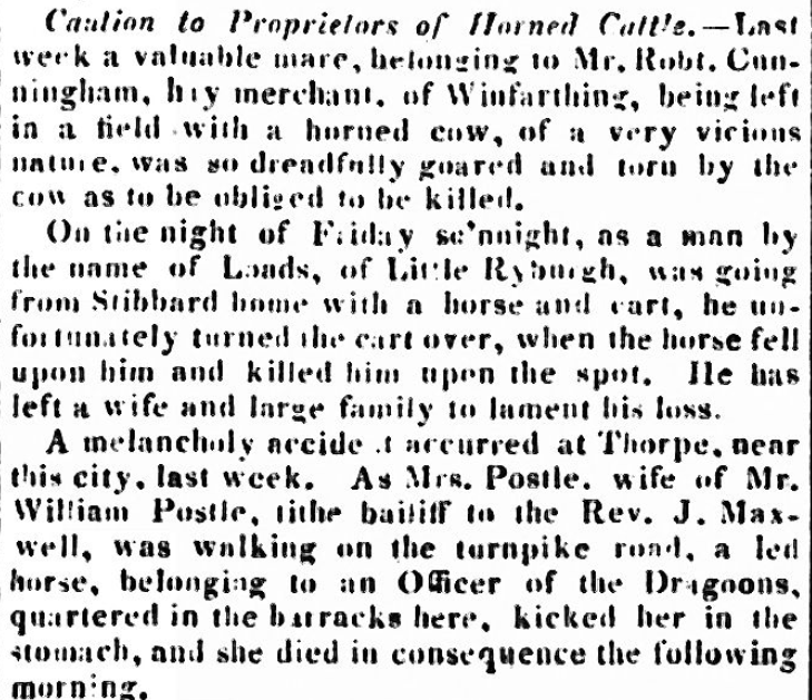A melancholy accident occurred at Thorpe, near this city, last week. As Mrs. Postle, wife of Mr. William Postle, tithe bailiff to the Rev. J. Maxwell, was walking on the turnpike road, a led horse, belonging to an Officer of the Dragoons, quartered in the barracks here, kicked her in the stomach, and she died in consequence the following morning.”