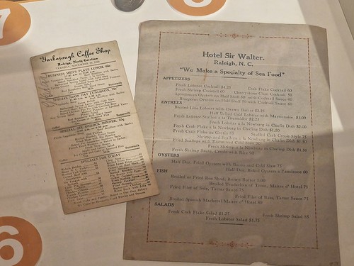 There are two menus on display in the museum, the one on the right is from the 1950s and is from the Sir Walter Hotel. But, it’s the menu from 1926 (Tuesday 30 November 1926 to be precise) that I thought was the more interesting, from the Yarborough House Hotel, which burnt down in 1928 and was never rebuilt. During its period of opening it was the place to be seen, and numerous Presidents, including Presidents Johnson, Roosevelt, Taft, and Wilson.