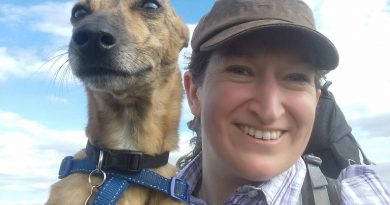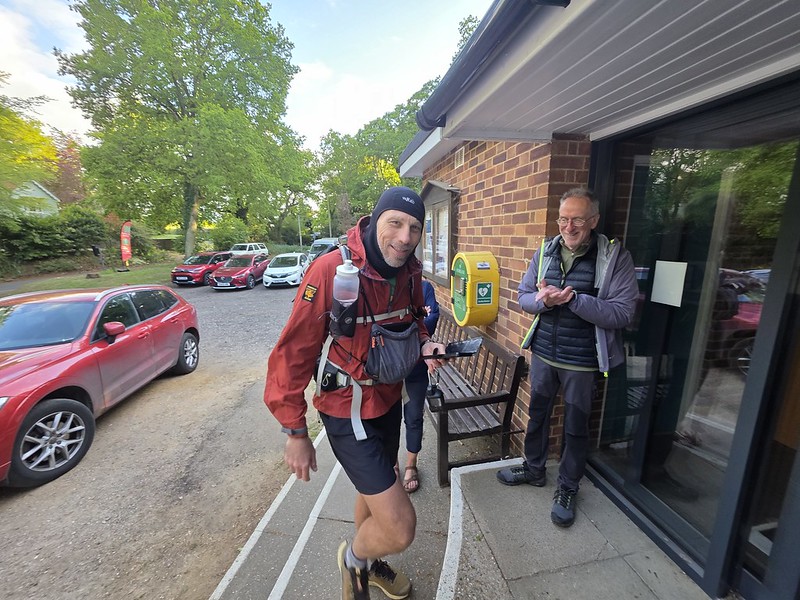 Chelle being greeted by Katie at the end of the walk, with Richard busy writing down his shopping list.