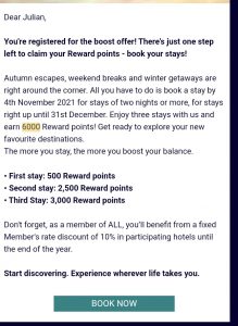 Well, that was lovely. This is an offer that Accor were running a couple of months ago, where they would give 500 points for a two night stay, 2,500 points for a second two night stay and then 3,000 points for a third two night stay. I achieved this and so the 6,000 points have been added to my account. That’s €120, which is enough to pay for three nights in a decent Accor hotel in Warsaw, which is very handy, so my stays for three days are all funded by that. It’s a very generous offer and well worth looking out for and signing up to.