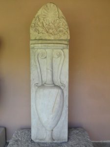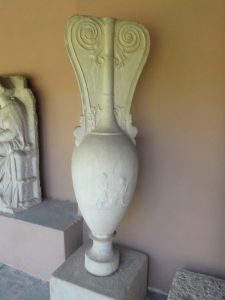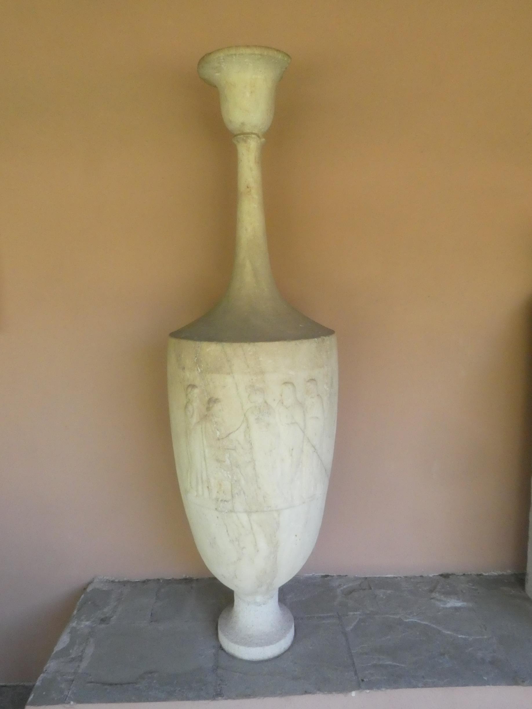 A funerary vase showing Aristomache, who is seated, saying goodbye to her husband. Impressively the date is known, it’s from 338BC.