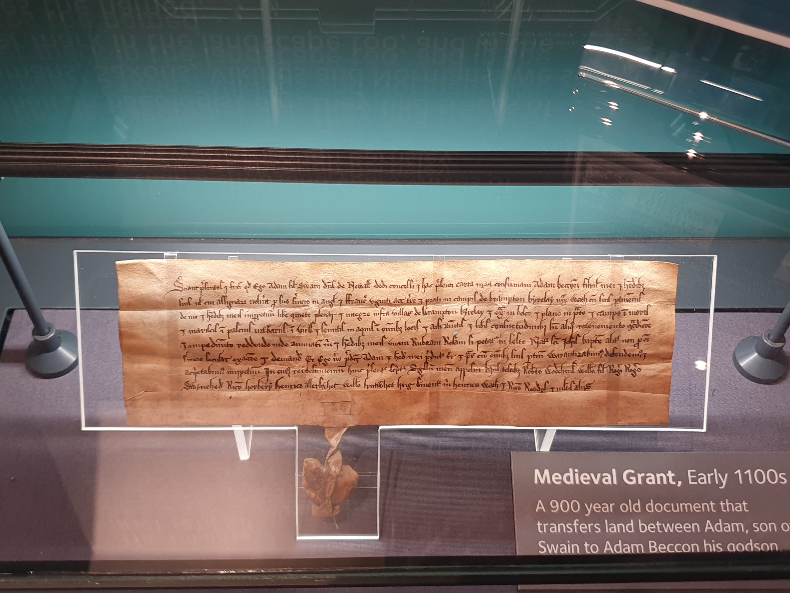 This is rather lovely, a grant which dates to the early twelfth century and is the oldest document which is held by Barnsley Archives. It is a grant which transferred 20 acres of land from Adam, son of Swain, Lord of Newall, to Adam Beccon, his godson. The payment was a red rose annually if it was requested, which sounds like a good deal for the godson.