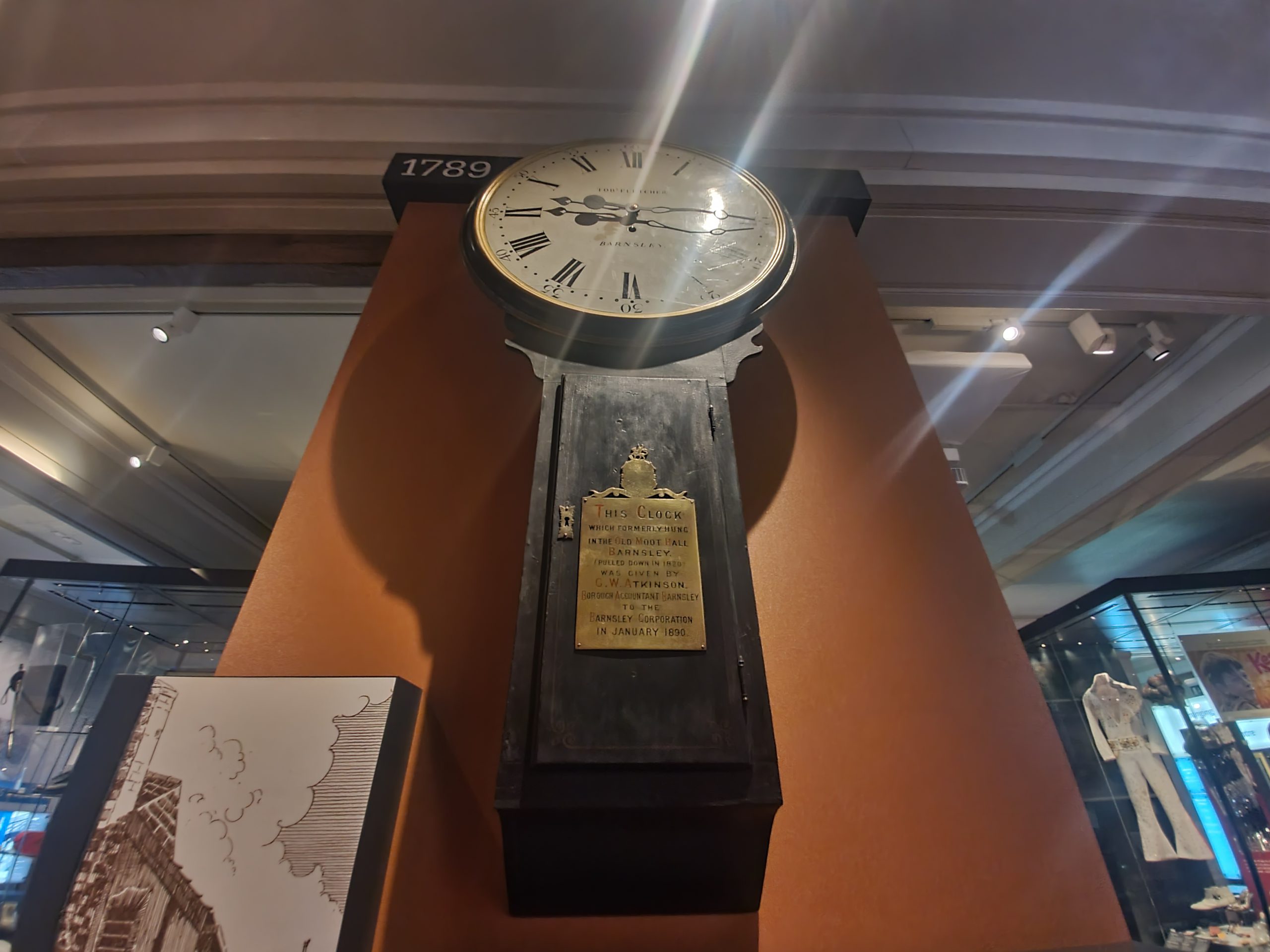 The Moot Hall Clock, which was located on, well, Moot Hall, until 1822. This was the centre of excitement in Barnsley with meetings upstairs and floggings downstairs, it all sounds really quite intriguing. It was made by the local clockmaker Tobias Fletcher in the 1790s and was taken down when the building was demolished in the 1820s.
