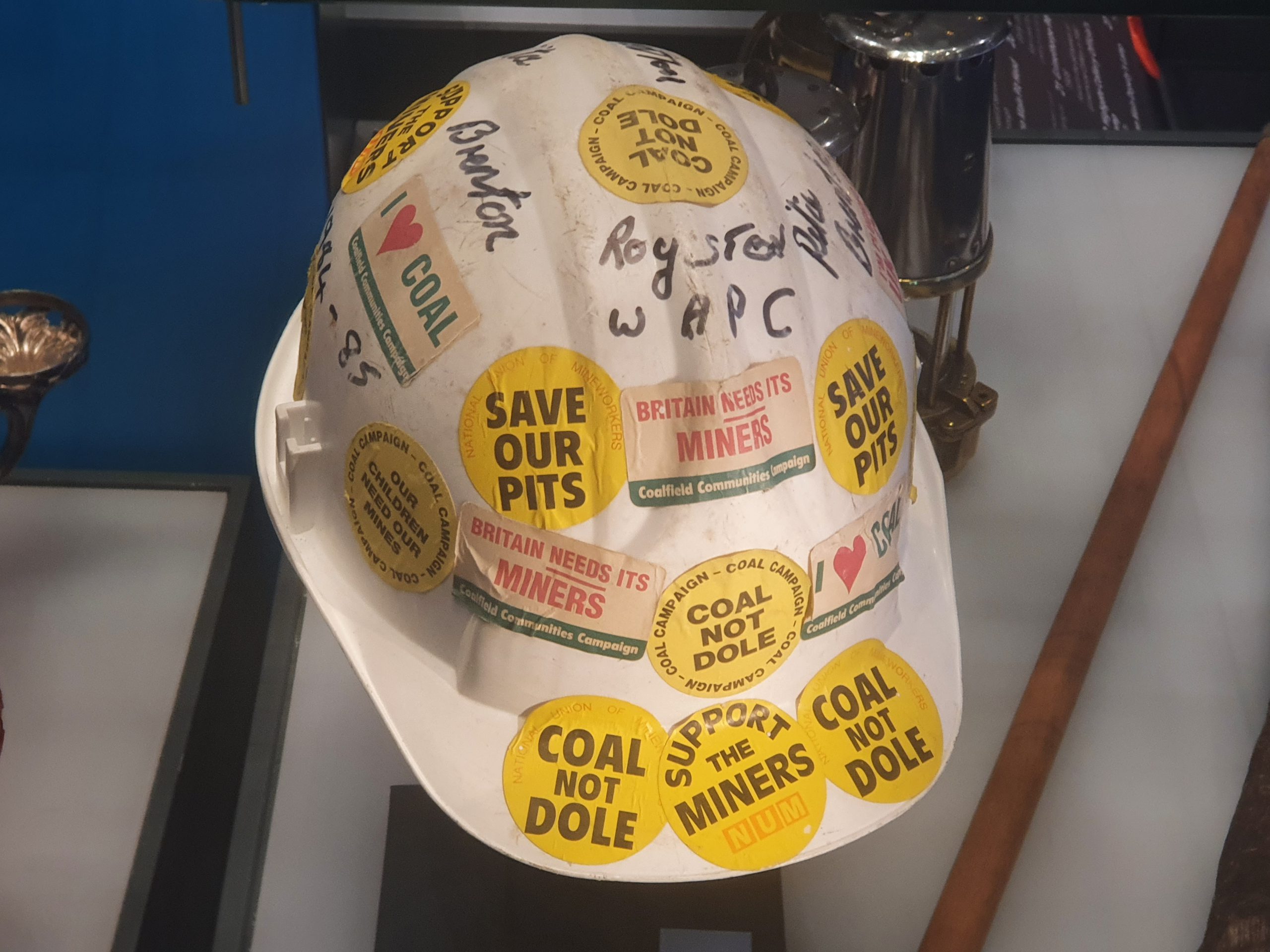 A “coal not dole” helmet worn by Rita Brenton, as Barnsley was once a mining town although the last one closed in the 1990s.