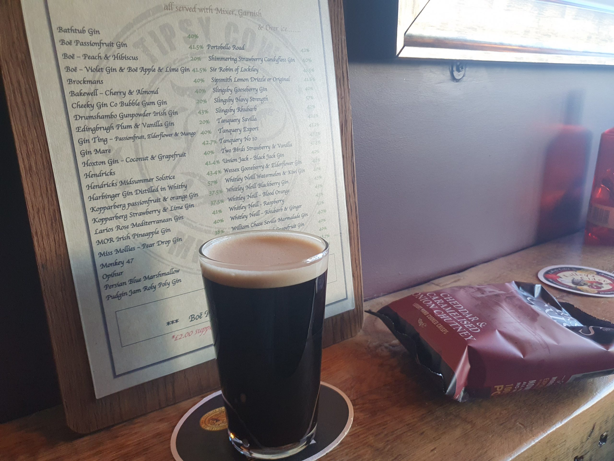 There’s my drink of the day, half a pint of the Nutty Ambassador, a rich and partially decadent hazelnut stout from Little Critter Brewery. Also visible are my cheese and onion crisps and the pub’s gin menu, which is really quite extensive for a location this size.