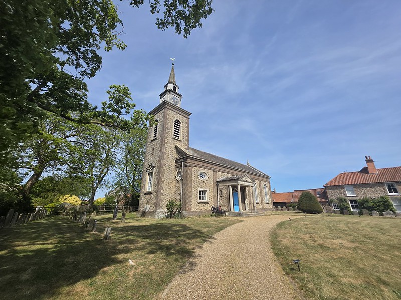 There’s a display board at the church which shows the post-war reconstruction of the building after it was mostly destroyed following an aircraft crash during the Second World War. The RAF Mosquito bomber crashed into the building on 6 November 1944, the only incident during the Second World War where a church was destroyed by an aircraft hitting it, as opposed to a bomb or other aerial attack. The task of rebuilding the church fell to the War Damages Commission and it took a few years to get going, with the work commencing in March 1953. The design for the new church was entrusted to Norwich architect J. Fletcher-Watson, who also designed the Bishop’s House in Norwich. He envisioned a Neo-Georgian style structure, a distinct contrast to many other village churches and one which I think looks rather elegant.