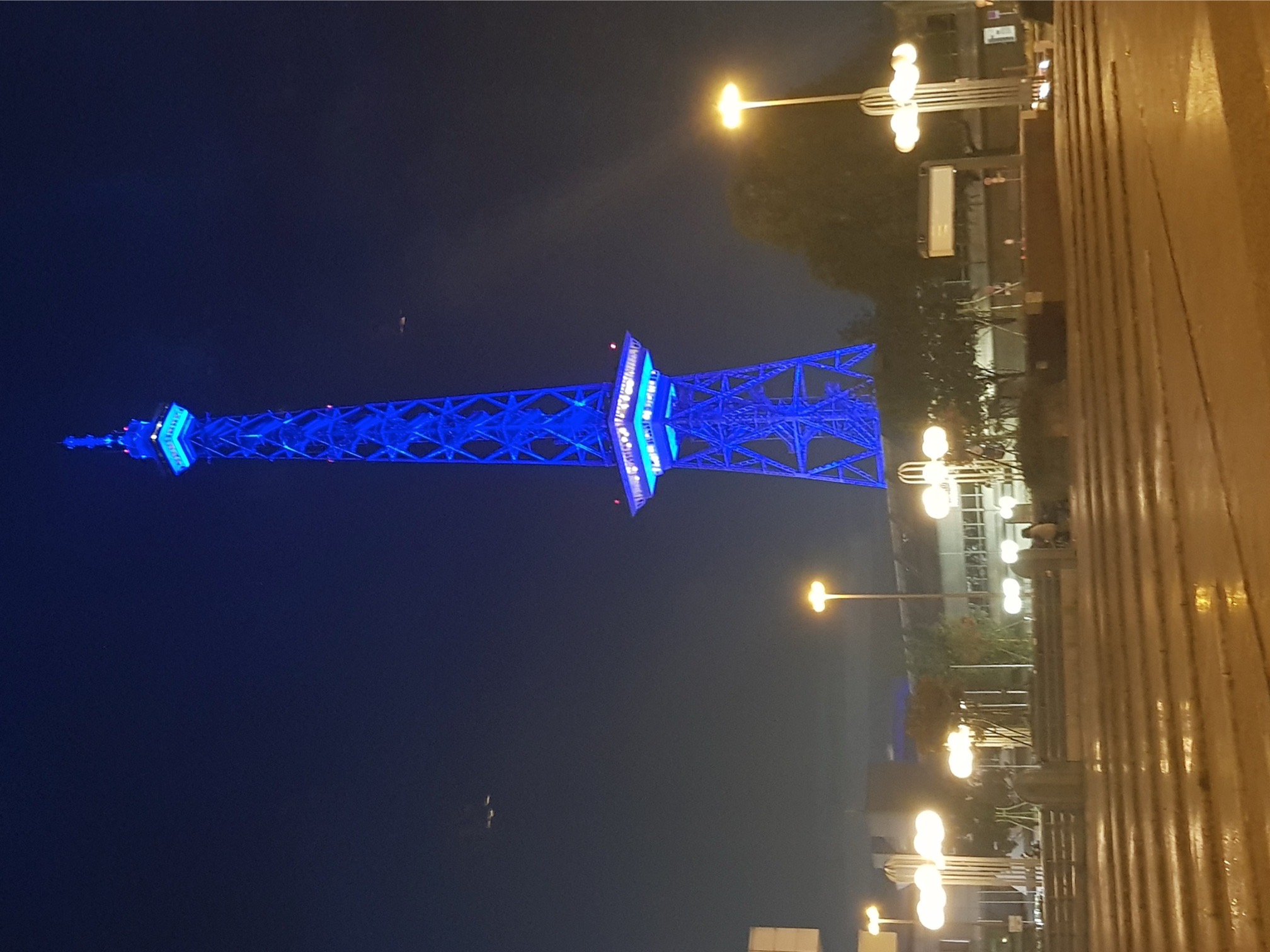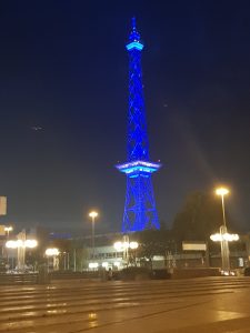 The well-lit Funkturm tower, located near to Berlin’s central bus station, which stands at 150 metres in height. It was built as a television tower in the 1920s, but ceased to be used for that purpose in 1973. It’s now a protected structure and there’s also a restaurant around 50 metres up.