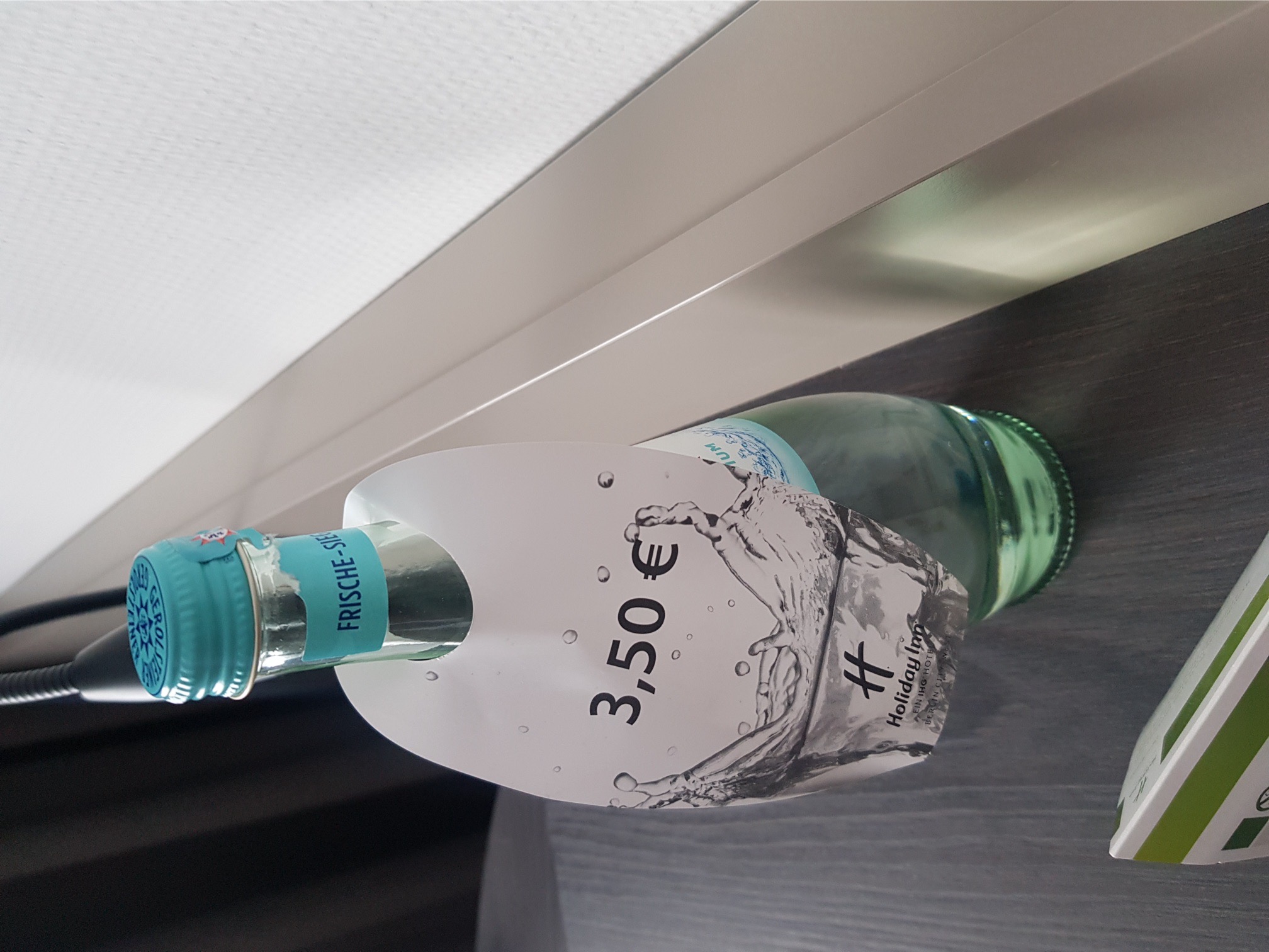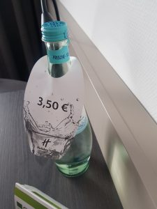 And on that subject of half-arsed efforts, this is cheap and nasty. Not only are they selling the water for €3.50 (which seems unnecessarily high given that all the other hotels on my trip have given it out for free), they haven’t bothered to check that the previous guest has broken the seal and drunk some of the water. If a hotel really insists on trying to charge for things like this, it could at least bother to check them.
