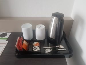 A slightly half-arsed tea tray, three coffees and one sugar. I’m guessing that this wasn’t properly restocked from a previous guest. And the cups didn’t match.
