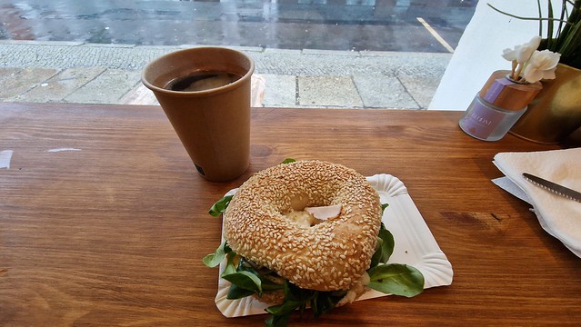 Anyway, it’s a cosy little place with high tables and more traditional seating, with the service being prompt and efficient especially as there was only one person taking the orders and making the food. The prices were moderate and there was an inviting and relaxed atmosphere. There’s a toilet in the cafe which is handy, as not all Berlin locations seem to have some decadent facilities, and it was warm which was quite important when trying to dry off. I think they also serve waffles, although I never tend to eat those, but they had some cakes to choose from as well.
