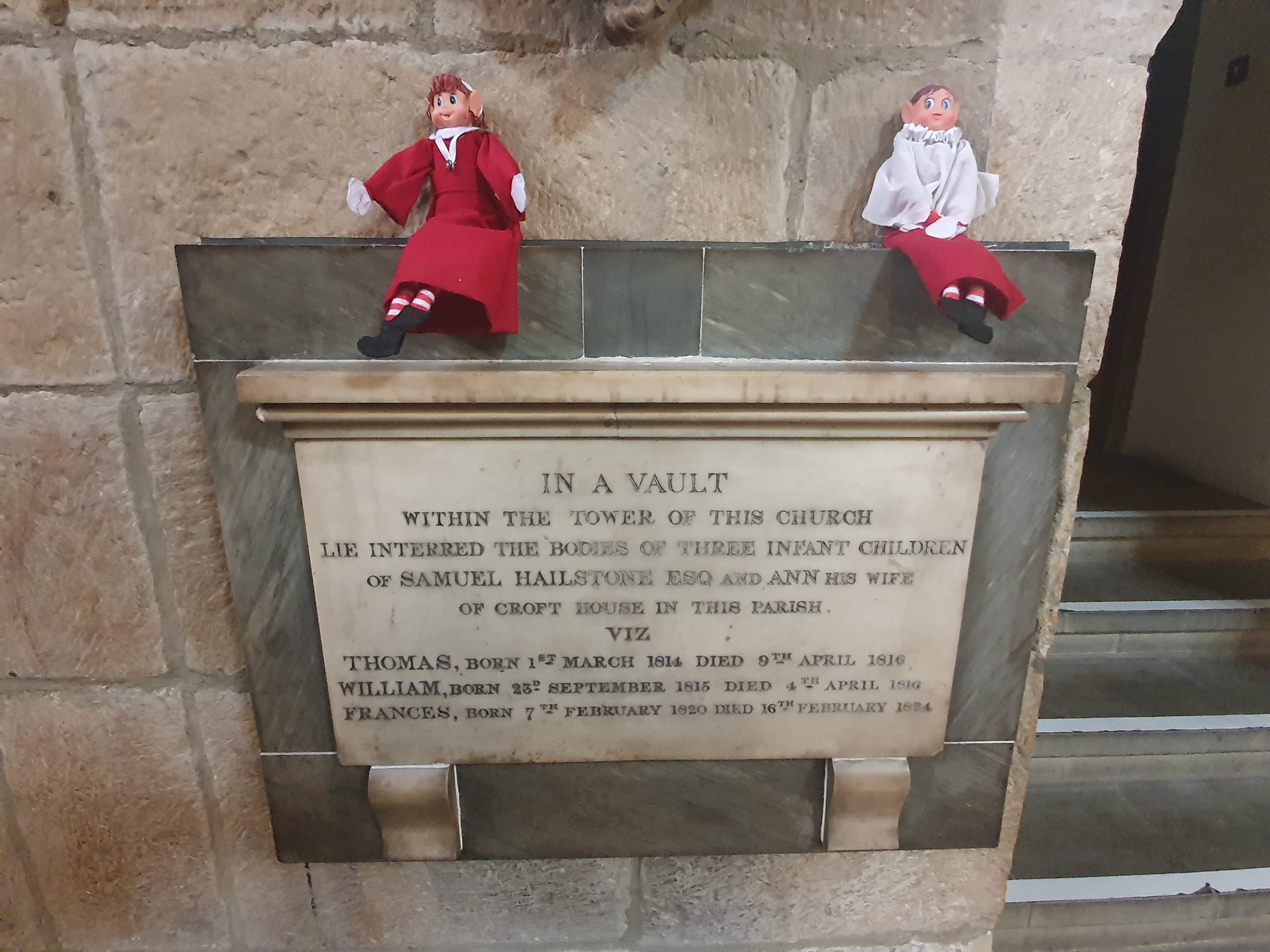 The vault in Bradford Cathedral which contains the remains of the three children of Samuel Hailstone (1768-1851) and his wife Ann Hailstone. The slightly unusual surname is likely to derive from someone in the family having once lived at a location called Hailstone, such as Hailstone Hill in Wiltshire or Hailstone Farm in Gloucestershire. It’s quite eye-catching due to how the cathedral has placed the little choir children.