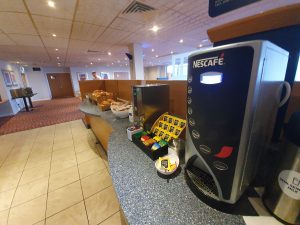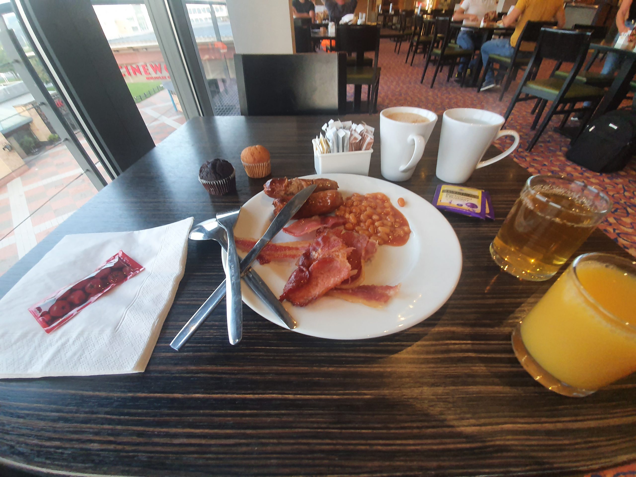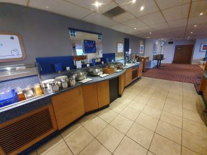 The breakfast set-up arrangement, with the standard Holiday Inn Express selection of four hot food items (sausage, bacon, baked beans and scrambled egg) as well as cereals, yoghurt and pastries. I’d have liked the bacon to have been crispier, but that’s my standard comment as I don’t like fat on bacon that hasn’t been frazzled. There were some decent fruit teas as well, a wider selection than I’ve usually seen.
