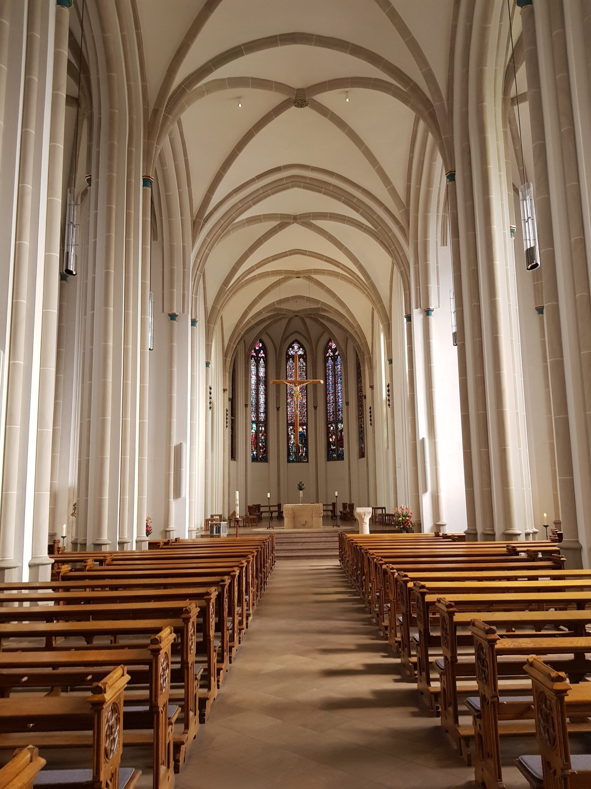 The tall nave, with the interior being bright and relatively free of decoration. There was a plan in the early nineteenth century to turn the nave into a warehouse and just use the choir area for worship, but this was narrowly avoided.
