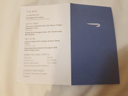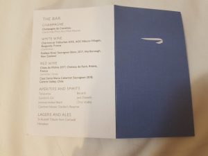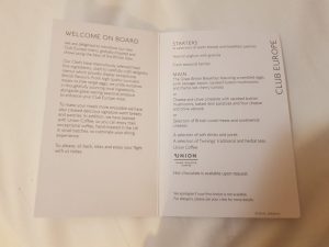 The menu for the flight.