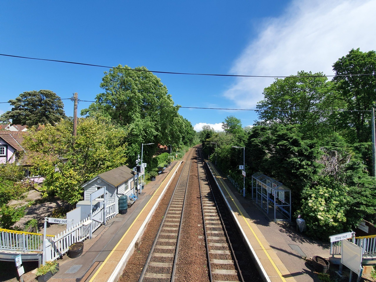 Still standing on the south platform, this is the line to Norwich. A booking office was placed on the north platform, with a waiting room and passenger accommodation installed on the south platform. Only the booking office now remains, other than for a basic shelter on the south platform.