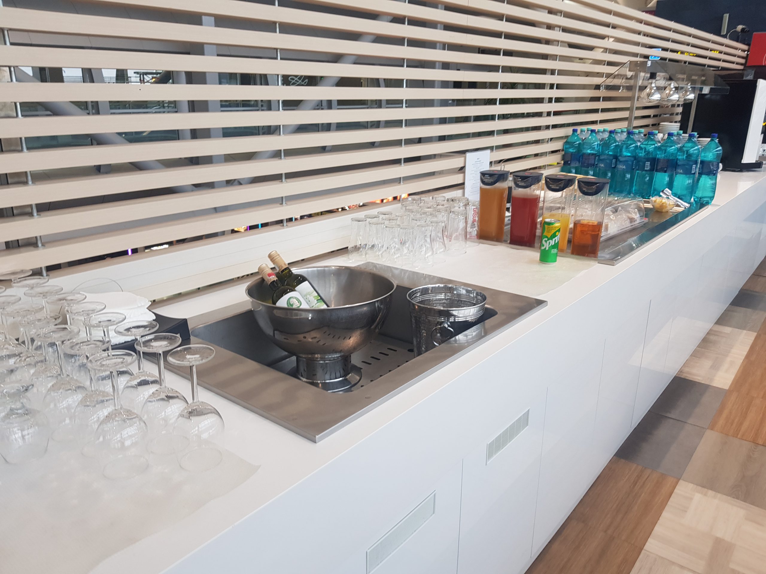 The main corridor of the lounge, there is food and drink on both sides with the seating area at the rear.