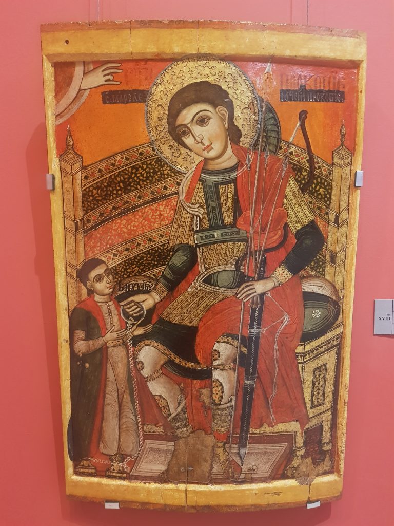 Anyway, a beautiful icon, painted on wood in the eighteenth century. The blue paint at the bottom left, from the coat of the minion (I don’t know who he is) crosses (excuse the pun) onto the frame and it looks untidy to me. Perhaps it was added later though….