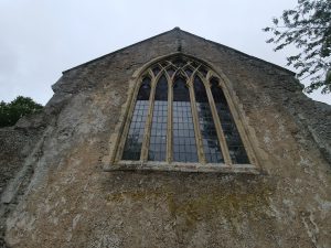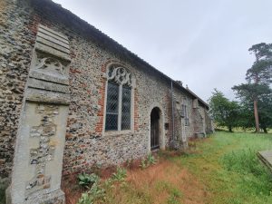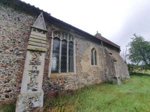 The east window, and this tells a story of its own. The church was deconsecrated in 1968 and was just left by the Church of England to a slow abandonment. Fortunately, it was taken over by the Redundant Churches Fund around ten years later, but there had been vandalism and destruction during that time. One of the oldest bells in Norfolk was stolen and much of the Victorian stained glass had been smashed. The Churches Conservation Trust gathered up what glass they could and they’ve reset it in the upper part of the window, but the lower part is now just plain glass. This could though have very easily had a different fate, perhaps something more like what happened at Bixley.