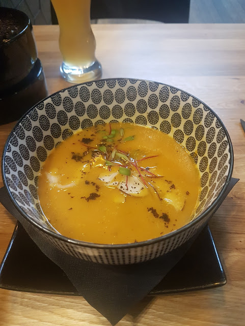 A cream of sweet potato soup, which despite being rather vegetabley was still excellent. A pleasant and quite powerful taste, with a creamy edge, and some texture from the vegetables.