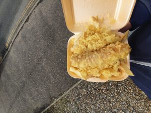 Usually the word ‘brilliant’ or similar often seems to be a lie in food venue names, there’s something more reliable in ‘Dave’s chips‘ which just seems more down to earth. But, there was a lot going for this fish and chip shop, primarily that it’s the best rated in Caister-on-Sea and there is plenty of competition for that in this holiday location (not that there are many holiday makers here at the moment). It was also the chip shop that had the longest queue outside and since I’m British and really quite like queueing (it provides that sense of order that I like) I opted for this one.