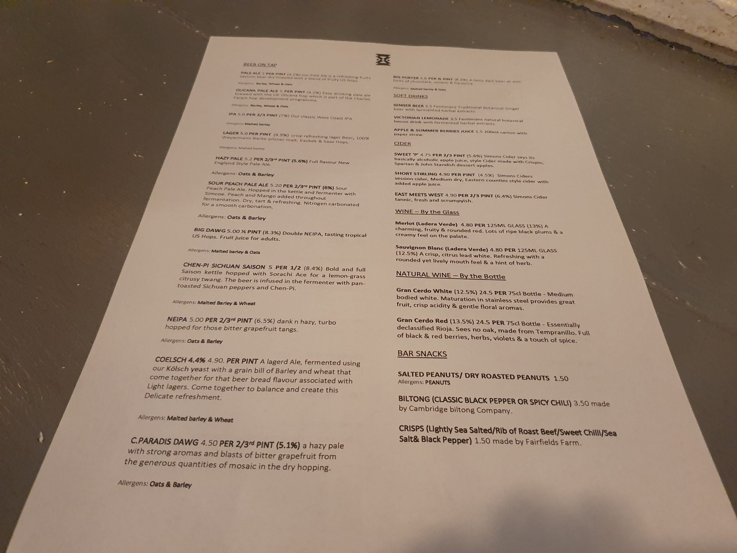 The beer menu. We did debate also ordering in one (well, more likely two) of the pizzas from Scott’s All Day who are located nearby, but we opted for a slightly cheaper option of a Sainsburys Meal Deal for the train journey home. The reviews on-line of the taproom are very positive and there are some ciders and soft drinks for the non-beer drinkers.