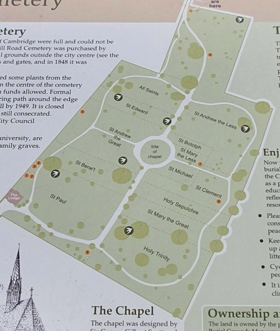 Across the country, there were problems in the early nineteenth century with churchyards in cities becoming full. The cholera epidemic gave the dual problem of more burials, as well as the risk of spreading disease by burying bodies in city centres. So, in 1844, a decision was wisely made to acquire a site of land where burials could take place and the Mill Road site was secured. There was also the inspired idea that the 13 parishes of All Saints, St Andrew the Great, St Andrew the Less, St Benedict, St Botolph, St Clement, St Edward, St Mary the Great, St Mary the Less, St Michael, St Paul, Holy Sepulchre and Holy Trinity could share the land.