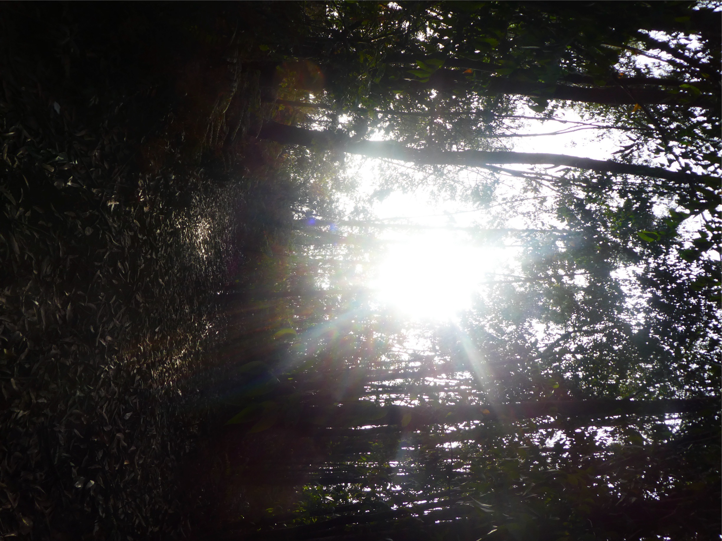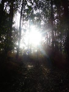 The sun shining through the woods, although the feeling of remoteness was taken away from me as an aircraft took over around 100 feet away.