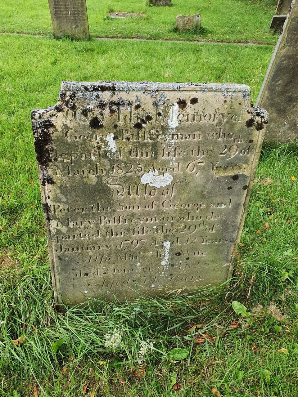 The gravestone also notes the burial of Peter Palfreyman, the son of George and Mary, who died on 29 January 1797 aged just 12 years old and Peter had been baptised in the church on 28 August 1785. Mary was also buried in this plot following her death in October 1828, aged 72. The Palfreyman family had come to Eyam after the plague issue of the late seventeenth century.