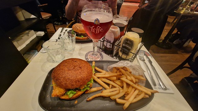 The chicken burger, which met my expectations, and Liam has some sort of beef burger which is visible in the background. I liked the variety of sauces, the food was well presented, the chicken was tender and it all tasted of a good quality, so I couldn’t ask for much more. The drink is a Ruby Leffe, which is something that I haven’t had before and is a red fruit beer, aromatic and more interesting than I thought it perhaps might be. I’ve been looking out for this in UK bars, so I was pleased to see it.