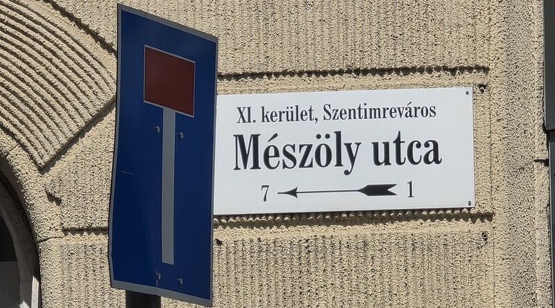 This is a typical street sign in Budapest, the XI. kerület being reference to it being in District XI, Szentimreváros is the neighbourhood and 7-1 are the house numbers on this section on the street. I have no idea why the street name is what it is, Google Gemini made a guess that it might be related to Miklós Mészöly (1921-2002) although it probably isn’t.