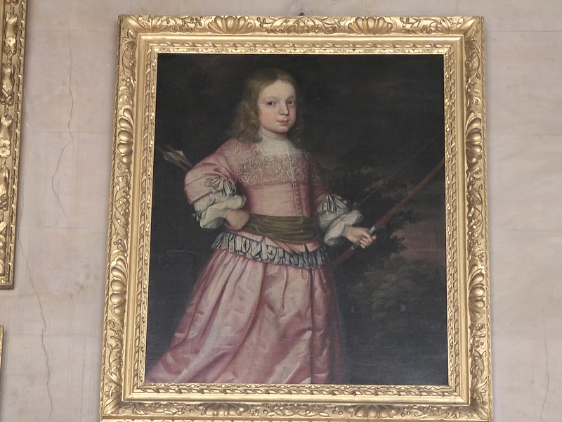 This painting is displayed in the Great Hall of Charlecote House and was given to the National Trust by Sir Montgomerie Fairfax-Lucy (1896 – 1965) in 1946 when the property and most of its contents were transferred to them. This is probably Davenport Lucy (1659/1660-1690) although it was previously thought to have been Elizabeth Lucy. This habit from the time of dressing children up as girls has certainly caused some issues in identifying centuries later on who is who. It’s not known who painted it and the National Trust’s estimated painting date of 1660 is a little aspirational given when Davenport was born and so it likely dates to around 1665.