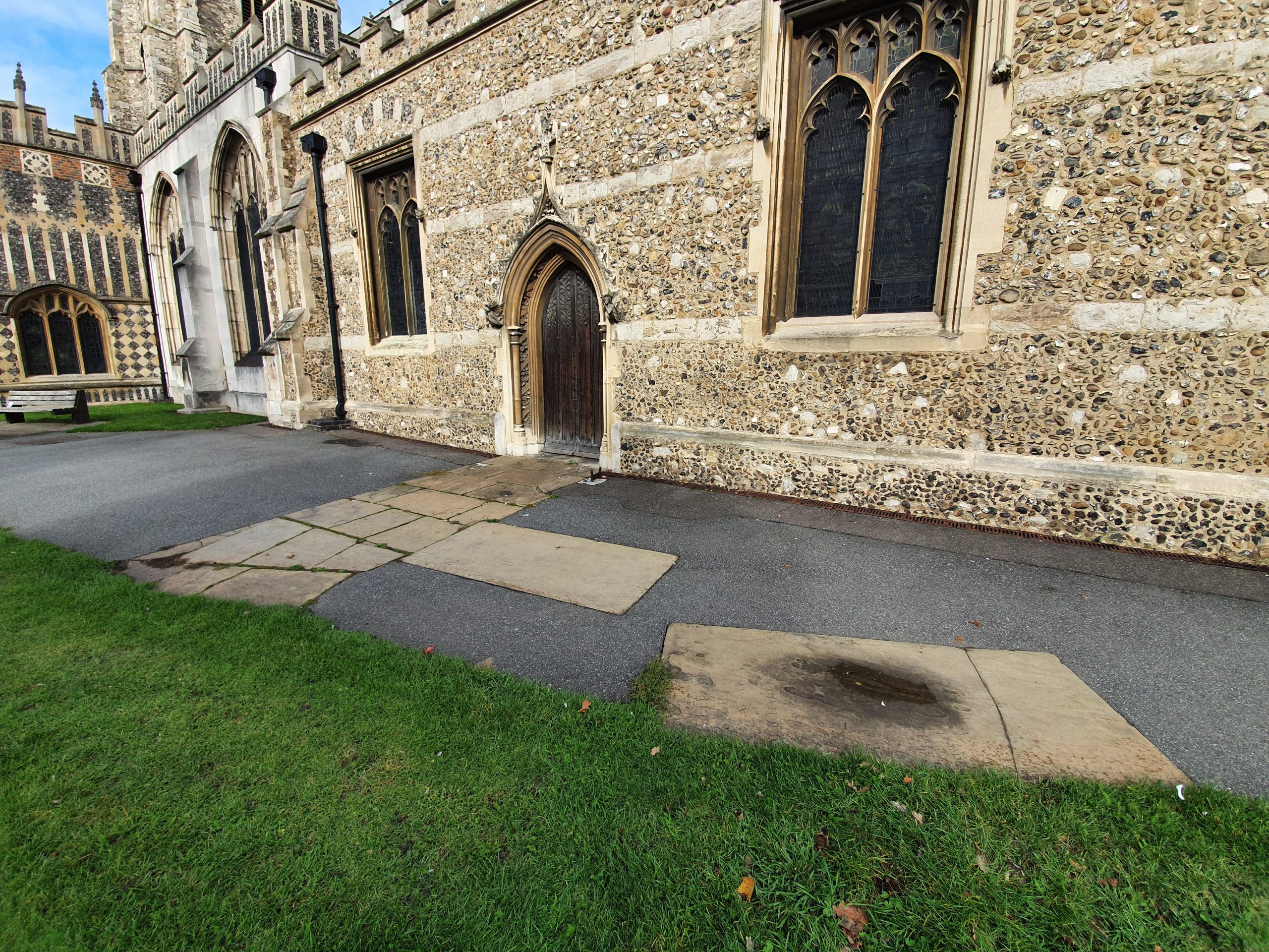 The area has all been reset, so the path which once led to the church door on the right (the priest’s door) has been removed and there’s a war memorial there now. Well, mostly removed. There’s a section still left of the old paving in front of the door, although it just leads to the grass now.