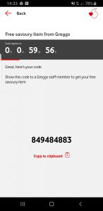 So, I was pleased to be given this free savoury item from Vodafone Rewards. Actually, I think this is a stupid promotion for Greggs, it’s unusable for people who don’t live near a Greggs (although I accept that isn’t many people) as it has to be claimed within an hour and the codes frequently get used up quickly. It’s a strange way of rewarding non-customers over customers as well, I suspect that this has a negative overall impact on Greggs. But, since Greggs seem to know what they’re doing, I’ll just carry on accepting the rewards when they’re sent.