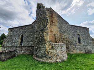There are some photos of what the tower looked like, including one just after it fell down, at https://www.roundtowers.org.uk/cockley-cley-all-saints/. In fairness to the Victorian restoration, it was concluded after an investigation that the tower hadn’t been touched during those works, so this wasn’t anything they’d fiddled about with.