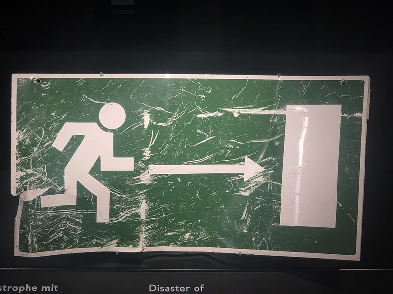 I like the museum’s exhibit on this, it’s a fire exit sign from around 2000 which was salvaged from the collapsed building. It is beautifully understated as a representation of the disaster that took place here.