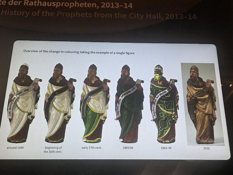 This screen in the museum shows the evolution of how the figures in their collection were painted. This shows a much more pure and white look back in the medieval period towards more colour recently, although goodness knows what happened between 1893 and 1895.