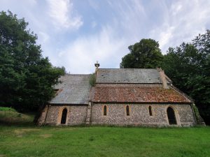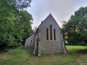 The church dates from the late nineteenth century and is unexceptional, but is in keeping with its rural environment. The church is apparently usually closed, although it is inevitably at the moment given the health situation, but it does have inside the twelfth-century font that was from St. Theobalds, a nearby ruined church. The building was designed by Thomas Jeckyll and although there’s a churchyard there are no burials in it, other than for a very small number of cremated remains.