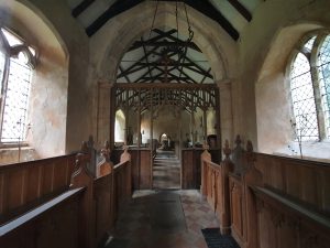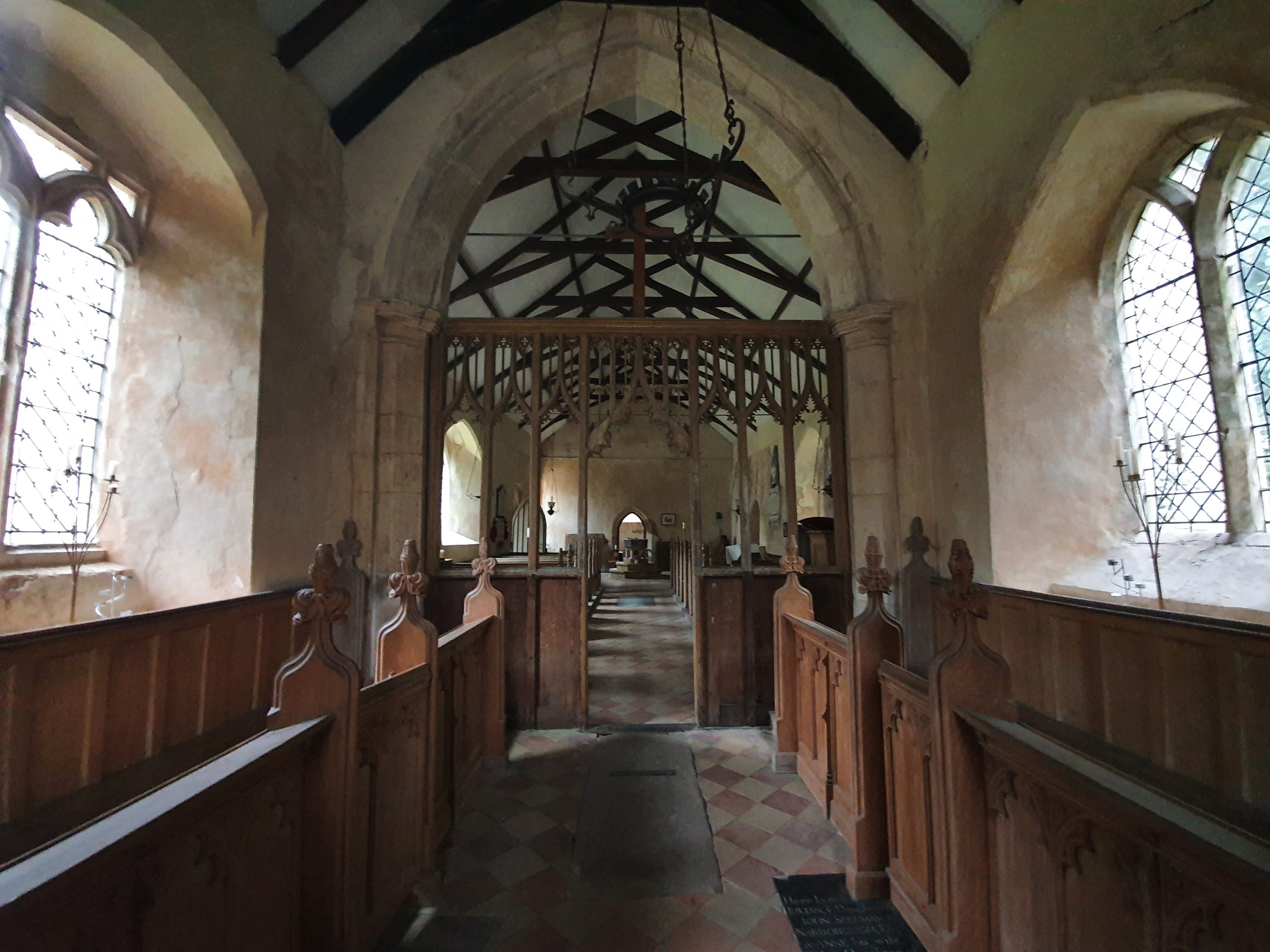 This photo was taken in the chancel, looking back down the church, with the rood screen visible. There was a bit of a renovation in the Victorian period, although not as brutal as in some other churches, when the roof was also repaired.
