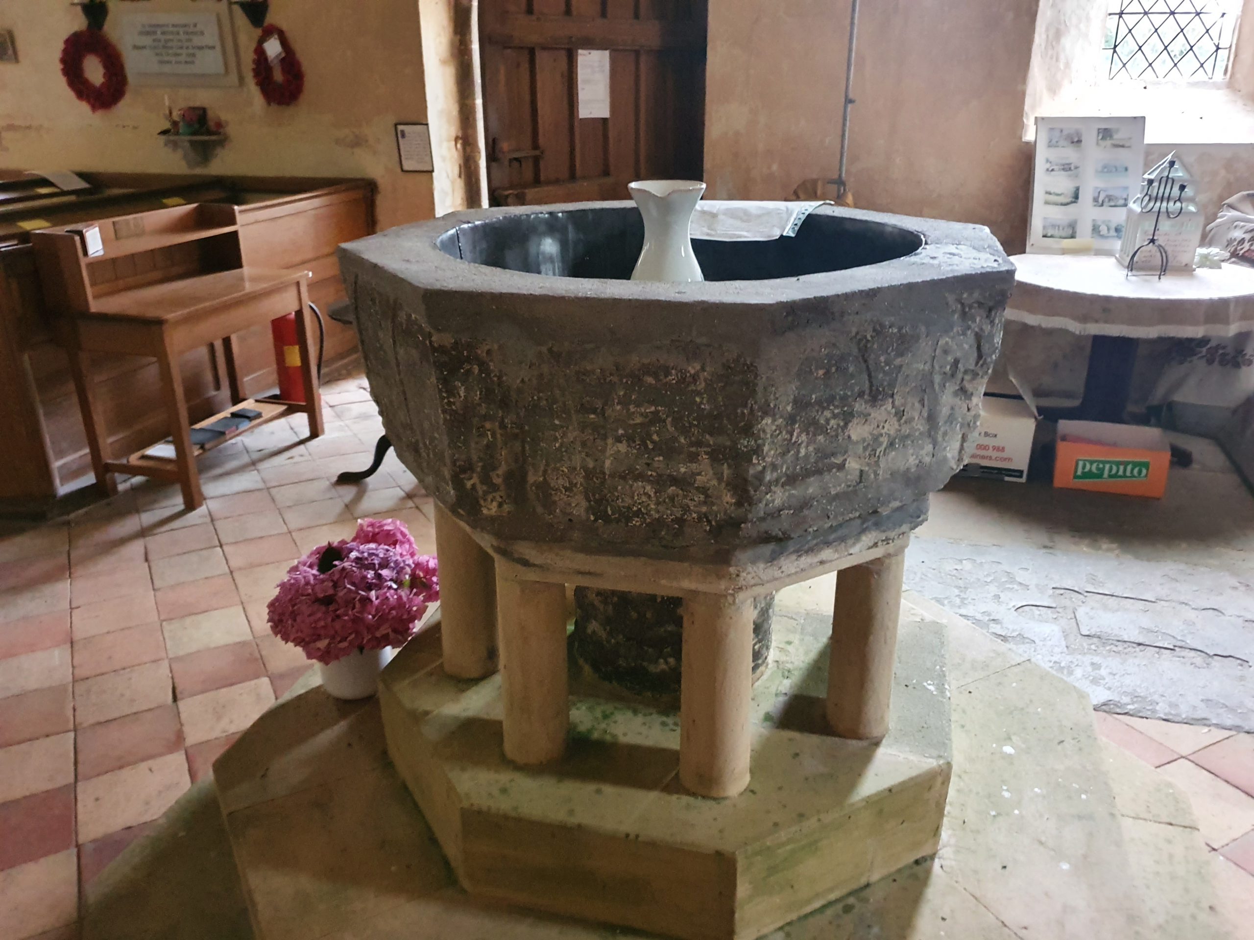 The font, which appears to be quite battered and worn, but it is some centuries old and is made from Purbeck marble.