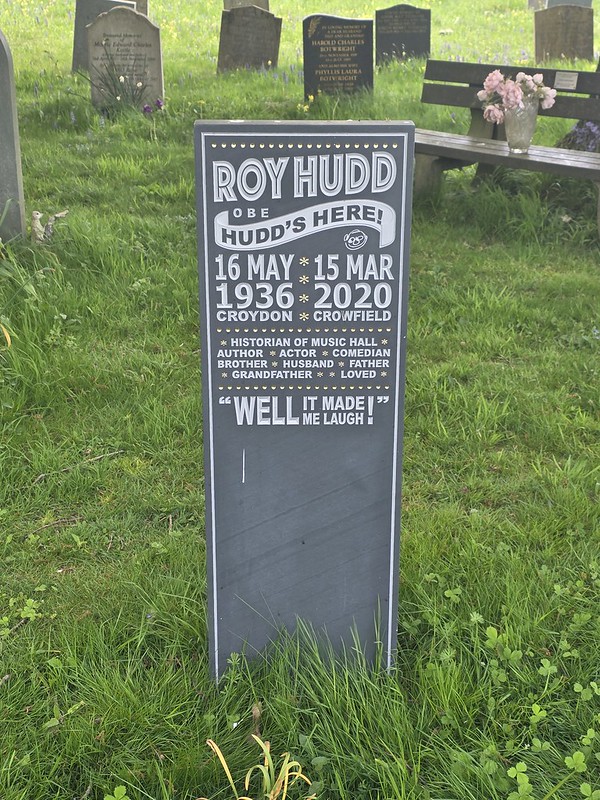 Roy Hudd and his wife had lived in Crowfield for some time and in February 2014 he unveiled the village’s commemorative sign which is a wooden carving which includes the church. He attended numerous local events, fetes and following his death on 15 March 2020 he was buried at the church. This rather impressive and distinctive headstone was erected at the grave just a few weeks ago and it is certainly eye-catching and its presentation is designed to look like a theatrical poster.