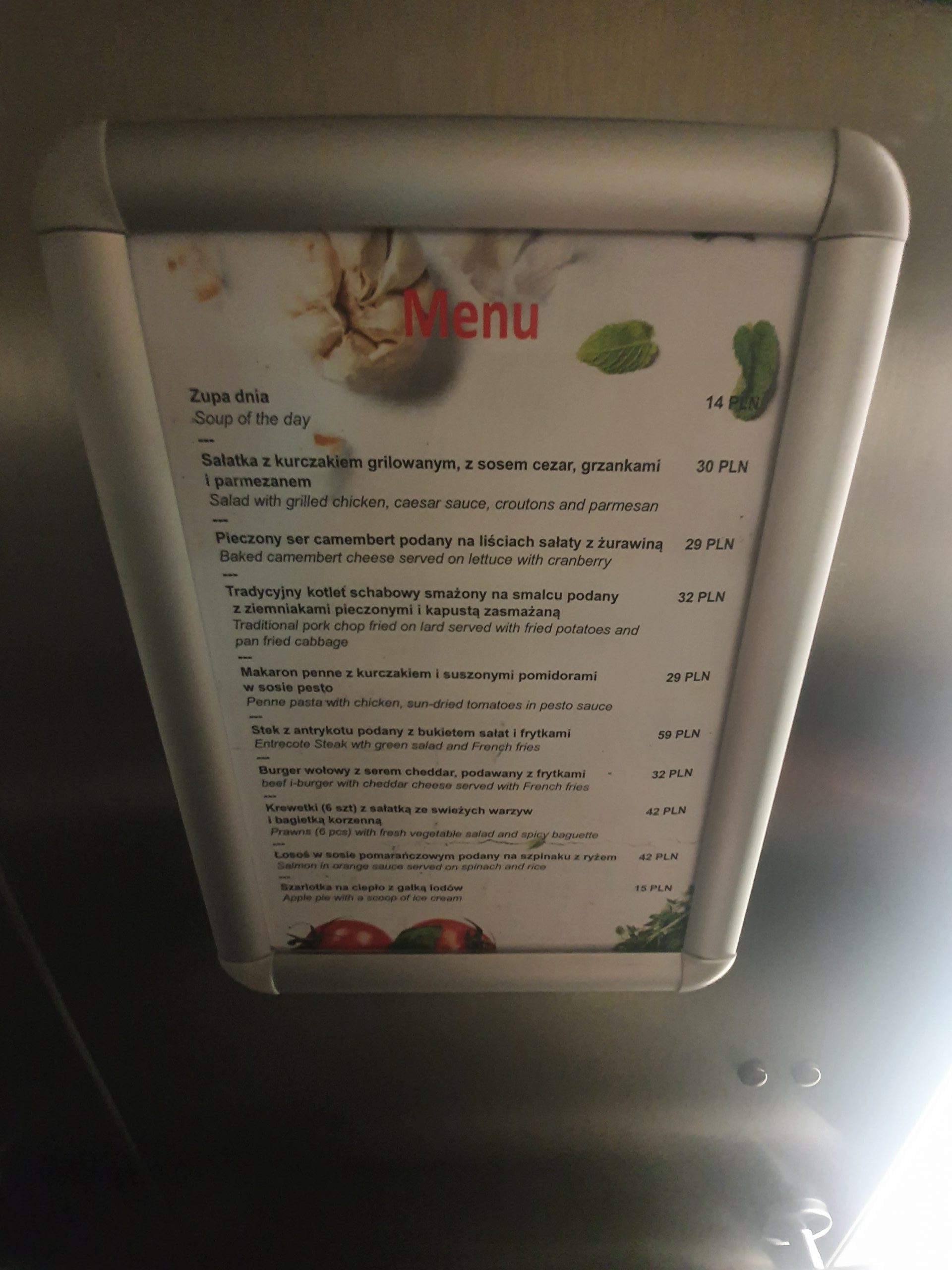 The food menu for anyone interested who is reading this (goodness knows who though). Hotel prices are inevitably towards the higher end of the scale, but they’re not unreasonable (divide by 5 for an approximate UK amount).