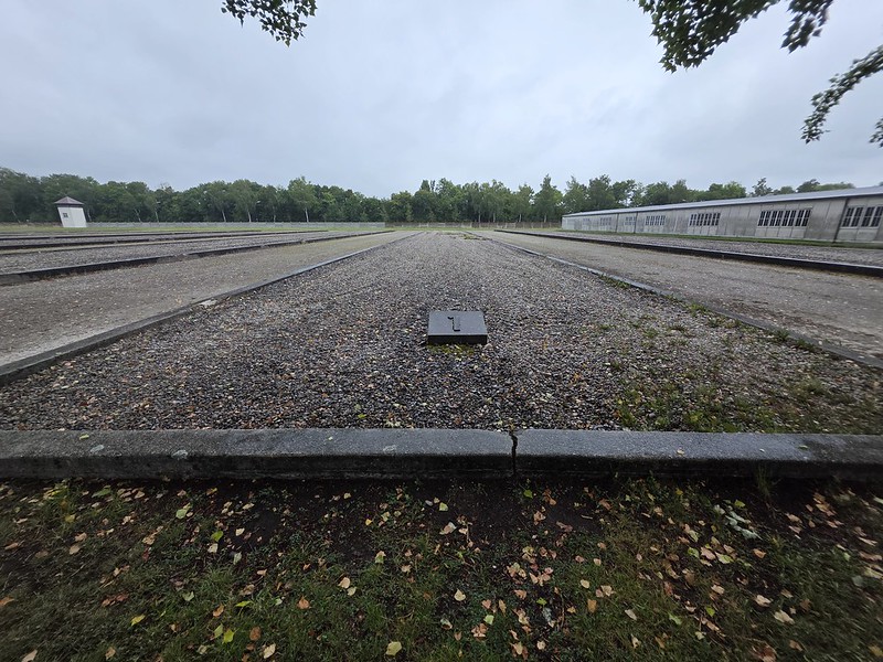Although there is one recreated dormitory building at Dachau, all of the former dormitory buildings on the left and right of this rather stately looking poplar lined main avenue (known as Camp Road) have gone with only their footprints remaining. The long rows of prisoner accommodation that once stretched across the roll-call square are now reduced to just these outlines on the ground, faint concrete or gravel borders marking where walls once stood. Walking down here in the rain, it was hard to really imagine just how noisy and unpleasant this area would once have been.