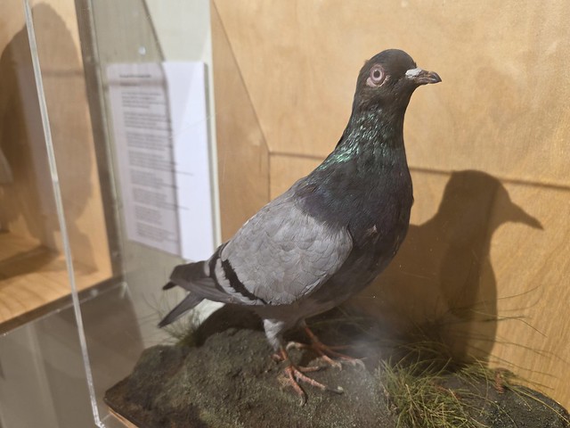 This is quite an important pigeon and known to many people in Derby. It’s a homing pigeon that flew into local legend in May 1913 when it completed a gruelling 1,001-mile journey from Rome to Derby in just under 24 hours. In the spring of 1913 there were more than 2,000 homing pigeons gathered in the Italian capital for the arduous “One Thousand Mile Athens to Rome Club” race. Entrants came from as far afield as Austria, Belgium, Germany and beyond, but it was a modest loft in Littleover, Derby, that produced the eventual victor. The pigeon was owned by professional baker Charles “Charlie” Hudson (1871–1948) and the bird known only by its band number “42PN150” took wing from Rome on the morning of 13 May. When it alighted in Derby just under 24 hours later, it had beaten every other pigeon by more than an hour, crossing the finishing loft at thirteen minutes past eight on 14 May. It did rather well to survive, as a number of the pigeons were shot on their way home which was a little sub-optimal.