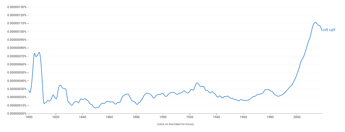 I use this phrase from time to time (I won’t name the friends I have in mind), defined by Grose as “low vulgar persons, mob, tag-rag and bob-tail” and it hasn’t much changed its meaning since the dictionary was published in the late eighteenth century. The phrase is from the late fifteenth century, it’s a corruption of the old French “rif et raf” meaning “one and all”, so there’s some heritage to this.